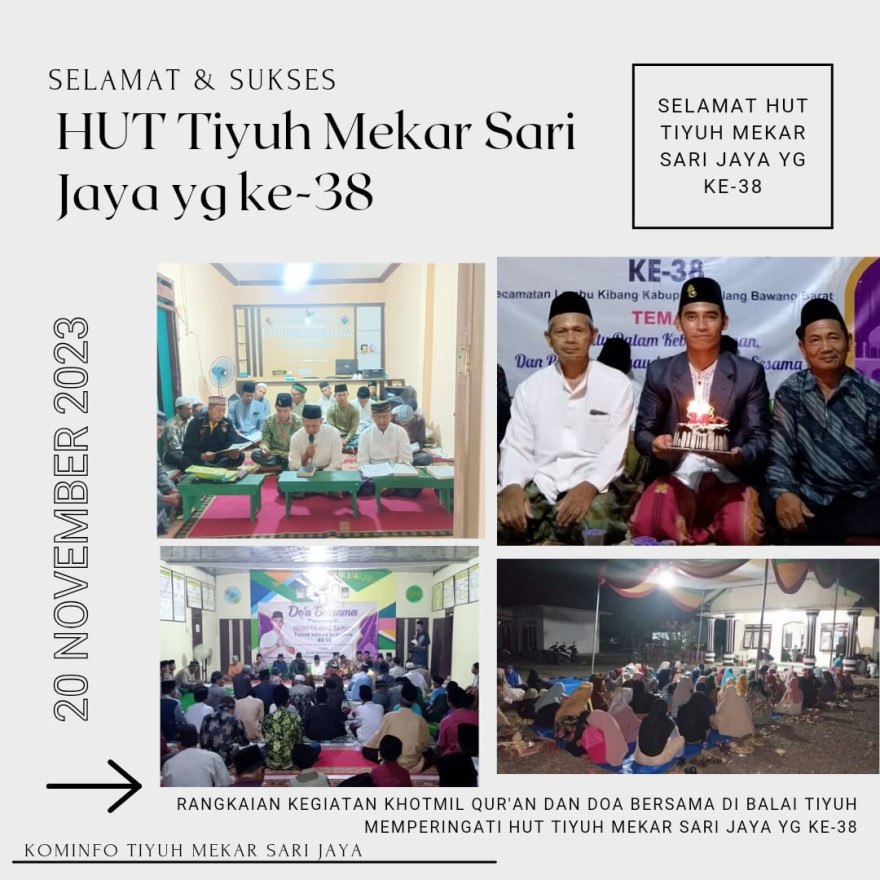 TIYUH MEKAR SARI JAYA - Alhamdulillah yaallah Barakallah Telah terlaksana dan sukses acara Khotmil Qur'an dimulai Minggu pagi dan dilanjutkan malam nya yaitu Doa Bersama Memperingati Hari Ulang Tahun Tiyuhku Tercinta Mekar Sari Jaya ke-38 Tahun 2023  Mengangkat Tema " BERSATU DALAM KEBERAGAMAN,...