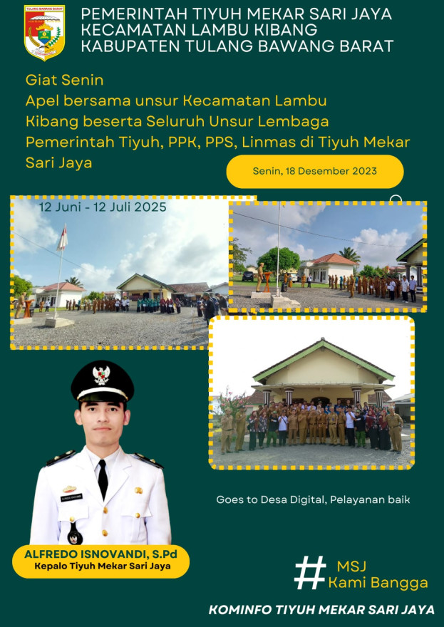 TIYUH MEKAR SARI JAYA - Apel pagi hari Senin, 18 Desember 2023 dilaksanakan di Tiyuh Mekar Sari Jaya dengan berdasarkan kepada surat yang telah dibuat oleh camat Kecamatan Lambu Kibang pada 15 Desember 2023 kemarin perihal Undangan Apel di Tiyuh Mekar Sari Jaya.Pada Senin ini apel turut juga mengikutsertakan...